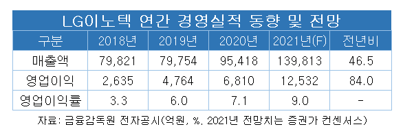 증권가 컨센서스에 따르면 LG이노텍의 올해 매출은 13조9813억원, 영업이익은 1조2532억원을 기록할 것으로 예상된다. 매출은 전년보다 46.5%, 영업이익은 84% 급증하는 것으로 매출이 10조원 대를 넘고, 영업이익이 1조를 넘기는 것은 역대최초다. 영업이익률도 2018년 3.3%, 2019년 6%, 2020년 7.1%, 2021년 9%로 뚜렷한 우상향 기조가 지속될 전망이다.
