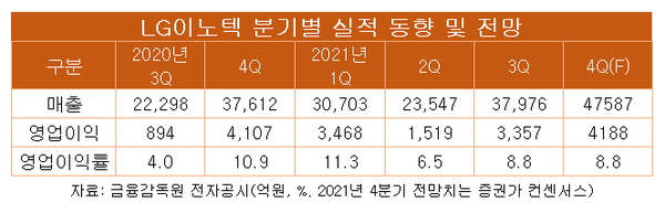 LG이노텍은 올해 3분기 3조7976억원, 영업이익 3357억원을 기록했다. 증권가 컨센서스를 상회하는 호실적을 달성했다. 4분기에는 매출이 3조7976억원, 영업이익 3357억원을 올리며 분기기준 최대 매출과 영업이익을 경신할 것으로 예상된다.