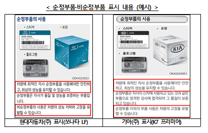 공정거래위원회는 현대자동차(주)·기아(주)가 자사 OEM부품(이하 ‘순정부품’) 및 그 외의 부품(이하 ‘비순정부품’)의 품질이나 성능과 관련하여 부당하게 표시한 행위에 대해 경고 조치하기로 결정했다.