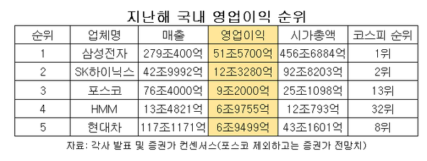 포스코는 영업이익 순위에서 지난해 사상최대 해운업 호황으로 실적 반전을 이룬 HMM과 호실적을 기록한 현대차도 큰 차이를 내며 밀어냈다. 두 회사의 지난해 영업이익은 6조9000억원 대로 예상된다.