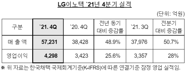 LG이노텍이 2021년 4분기에 한국채택 국제회계기준(K-IFRS)으로 매출 5조7,231억원, 영업이익 4,298억원을 기록했다. 전년 동기 대비 매출은 48.9%, 영업이익은 25.6% 증가했다. 전분기 대비 매출은 50.7%, 영업이익은 28% 증가했다.