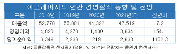증권가 컨센서스에 따르면 연간 실적발표를 앞두고 있는 아모레퍼시픽은 지난해 4조7519억원의 매출과 3634억원의 영업이익을 올릴 것으로 예상된다. 전년보다 매출은 7.2%, 영업이익은 154.1% 증가하는 것이다. 코로나19라는 위기상황 속에서도 선전했다는 평가가 지배적이다.