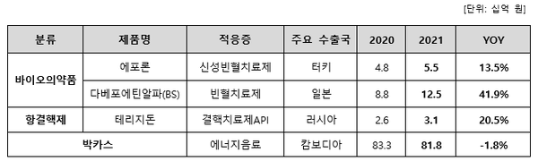 신성빈혈치료제인 ‘에포론’은 전년 대비 13.5% 성장하며 주요 수출국인 터키에서 점차 입지를 넓혀가고 있고 일본에서는 ‘다베포에틴알파(BS)’로 출시 이후 처음으로 매출 100억 원을 돌파하며 전년대비 41.9% 성장했다.
