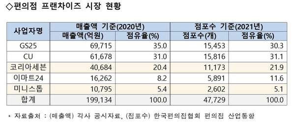 국내 편의점 시장은 2020년 매출액 기준 19조 9134억원 규모로 1위 GS25와 2위 CU가 각각 35%, 31%를 차지하고 있고 3위 세븐일레븐이 20.4%, 이마트24와 미니스톱은 각각 8.2%, 5.3%를 차지하고 있다.