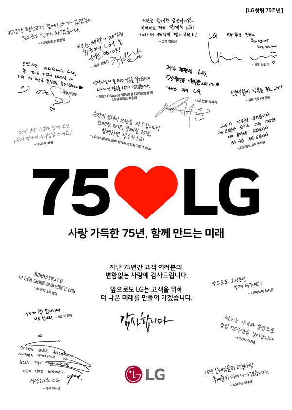 아울러 LG는 고객에게 감사와 다짐의 마음을 표현하는 75주년 엠블럼을 개발했고, 서울 광화문·홍대·강남·잠실야구장 등 주요 옥외 전광판에 전시할 예정이다.