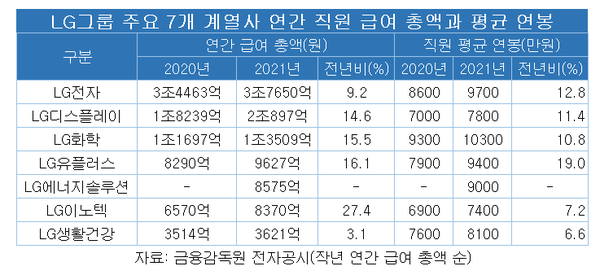 LG에너지솔루션을 합친 7개 계열사의 지난해 직원 평균 연봉 역시 8814만원으로 전년(7883만원)보다 11.8% 증가했다.