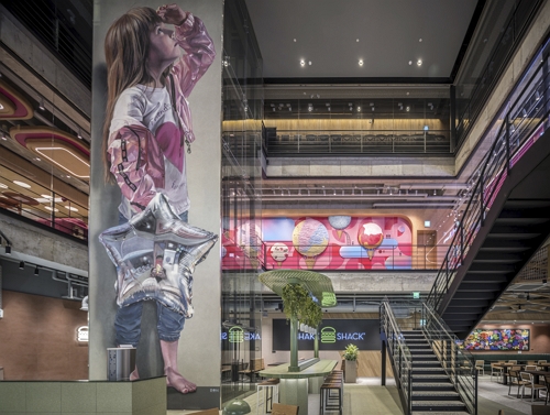 1층 쉐이크쉑 매장은 ‘팝핑! (Popping!)’을 주제로 한 그래픽 디자이너 차인철의 드로잉 작품을 통해 에너지가 넘치고 새로운 경험을 제공하는 쉐이크쉑을 표현했다.