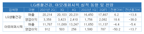 화장품 업계 2위인 아모레퍼시픽도 고전이 예상된다. 아모레퍼시픽은 올해 2분기 1조1137억원의 매출과 787억원의 영업이익이 예상된다. 전년동기비 매출은 5.4%, 영업이익은 13.7% 각각 감소하는 수치다.