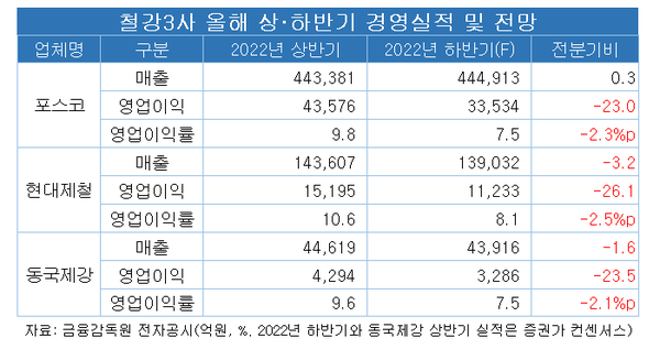 철강3사 올해 하반기 영업이익, 상반기 대비 23~26% 감소 전망