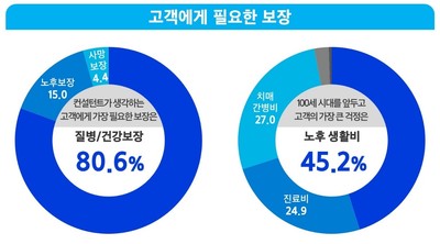 이 밖에 고객들이 100세 시대를 앞두고 가장 걱정하는 것을 묻는 질문에는 ‘노후생활비’가 45.2%로 가장 많이 선택됐으며 ‘치매/간병’이 27%, ‘진료비’가 24.9%로 뒤를 이었다.