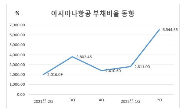 아시아나항공은 2022년 상반기 말 기준 부채비율이 6544%에 이른다. 지난해 말보다 4134%p 상승했다. 조만간 3분기 재무제표가 공개되면 아시아나는 완전자본잠식 상태를 드러낼 것으로 예상된다. 연말까지 이를 해소하지 못할 경우 아시아나항공은 상장폐지 기로에 놓이게 된다. 한국거래소에 따르면 상장사가 회계연도 말 기준 완전자본잠식 상태라면 즉시 상장폐지 사유가 된다.