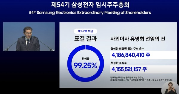 삼성전자는 3일 오전 경기도 용인 삼성전자 인재개발원에서 임시 주총을 열고 유명희 전 산업통상자원부 통상교섭본부장과 허은녕 서울대 공대 교수를 사외이사로 선임하는 안건을 상정했다. 안건은 원안대로 가결됐다. 허은녕 사외이사는 88.29%, 유명희 사외이사는 99.25%의 찬성률로 선임됐다. 안건 의결에 따라 삼성전자 이사회 구성은 사외이사 6명과 사내이사 5명으로 변경됐다.