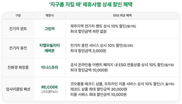 SKT는 ‘지구를 지킬 때’ 서비스를 제공하기 위해 전기차 충전 분야 티맵모빌리티와 에버온, 전기차 렌트 분야 그린카, 업사이클링 패션 분야 코오롱인더스트리FnC부문, 친환경 화장품 분야 이니스프리 등 친환경 기업∙브랜드 5곳과 힘을 모았다.