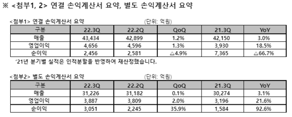 SKT는 별도 재무제표 기준 2022년 3분기 매출 3조 1226억원 영업이익 3887억원을 기록, 전년 동기 대비 각각 3.1%, 21.6% 성장했다. 별도 순이익은 하나카드 지분 매각에 따른 일회성 이익으로 전년 동기 대비 92.6% 증가한 3051억원을 기록했다.
