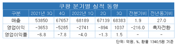 쿠팡은 3분기 영업이익 1037억원(7742만 달러), 당기순이익 1215억원(9067만 달러)을 기록하며 2014년 로켓배송 론칭 후 첫 분기 기준 흑자전환에 성공했다. 지난해 3분기 영업손실 3억1511만달러(3653억원), 순손실 3억2397만달러(3756억원)을 기록한 점을 감안하면 드라마틱한 흑자 전환에 성공한 것이다.