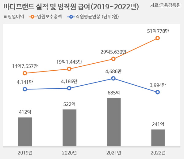 금융감독원 전자공시시스템에 따르면 바디프랜드의 매출과 영업이익은 2021년까지 우상향하다 2022년 역성장했다. 실적은 곧 직원 급여에 반영됐다. 직원 평균연봉은△2019년 4141만 원 △2020년 4186만 원 △2021년 4686만 원 △2022년 3994만 원 등이다.