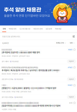 실제 아르바이트 플랫폼 알바몬이 연휴기간 단기 일용직 공고를 모아둔 '추석 알바 채용관'에는 구인 공고가 약 3200개(27일 기준)가 올라와 있다. 가장 보수가 높은 공고의 경우, 일급이 17만원이었다.