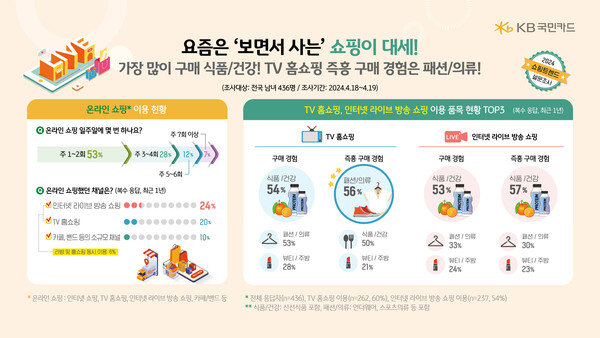 KB국민카드가 온라인 쇼핑 업종 중 TV홈쇼핑, 인터넷 라이브 방송을 중심으로 신용 및 체크카드 매출 데이터를 활용해 소비 패턴을 분석하고 고객 패널 '이지 토커'를 대상으로 이용 현황에 대한 설문 조사를 진행했다고 23일 밝혔다.