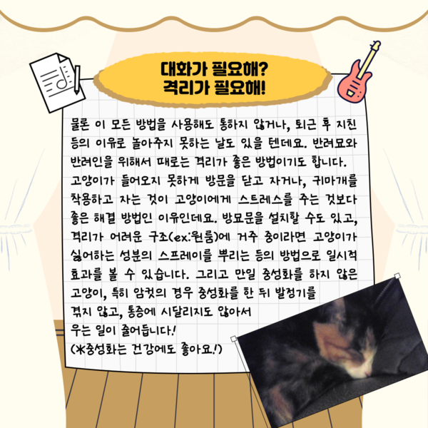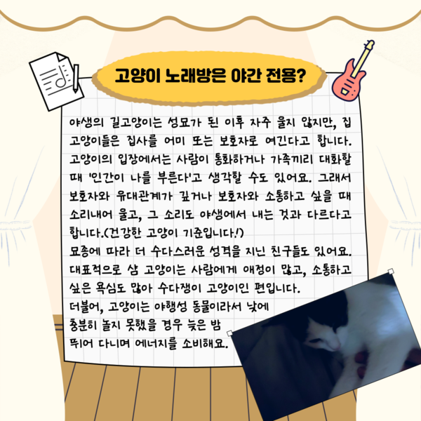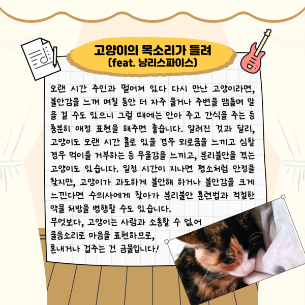 이전 기사보기 다음 기사보기 제25화, 고양이 합창단에 어서 오세요 [하이영! 야옹!] 바로가기 복사하기 본문 글씨 줄이기 본문 글씨 키우기 스크롤 이동 상태바 문화 일반 제25화, 고양이 합창단에 어서 오세요 [하이영! 야옹!] 기자명 이하영 입력 2024.10.18 08:30 댓글 0 다른 공유 찾기 바로가기 본문 글씨 키우기 본문 글씨 줄이기 이 기사를 공유합니다 페이스북(으)로 기사보내기 트위터(으)로 기사보내기 네이버블로그(으)로 기사보내기 네이버라인(으)로 기사보내기 핀터레스트(으)로 기사보내기 URL복사(으)로 기사보내기 닫기 반려인구 1300만명 시대. 반려동물과 함께 사는 우리의 모습. 반려인 이하영 기자와 함께 생생한 반려동물과 일상을 함께 하시죠! 이하영 20091222_snsanf@ngetnews.com 키워드 #하이영! 야옹! 저작권자 © 뉴스저널리즘 무단전재 및 재배포 금지 공유 이메일 기사저장 관련기사 제24화, 맹견도 더는 무섭지 않아요 [하이영! 야옹!] 제23화, 가을맞이 반려동물 축제 놀러오세요 [하이영! 야옹!] 제22화, 천고마비의 가을, 반려동물 비만 조심! [하이영! 야옹!] 제21화, 3은 세상에서 가장 완벽한 숫자 [하이영!야옹!] 제20화, 댕냥 위해 쿨매트를 깔고 [하이영! 야옹!] 제19화, 동물병원 어디로 가야 하나요? [하이영! 야옹!] 제18화, 반려동물 미아, 어떻게 찾나요? [하이영! 야옹!] 제17화, 임시보호를 아시나요?[하이영! 야옹!] 주요기사 '코리아 핀테크 위크 2025' 개막…"AI 경쟁력이 금융 생존 척도" 핀테크 찾은 이억원 금융위원장 "AI 경쟁력이 생존 척도" 메리츠증권, 5천억원 유상증자 단행 LS, 美 생산거점 확보 위한 LS전선 유상증자 참여 애플, 14년 만에 스마트폰 출하량 1위 탈환 눈앞…아이폰17 판매 호조 SKT, 삼성전자와 6G AI-RAN 기술 공동 개발 이 시각 추천뉴스 GM은 '철수', 르노는 '전환'…같은 매각 두고 해석 '극과 극' 거래소, 코스피200 종목 정기변경···LG CNS·산일전기 편입 포항제철소서 9일 만에 또 사망…장인화 회장 안전 약속 무색 LG에너지솔루션, 랜섬웨어 피해 정황…글로벌 공급망 '경고등' 펄어비스 포트폴리오 확장 '붉은사막'에 달렸다 몸값 3조 외친 에이블리, 현실은 '7천억설'…투자 유치 앞두고 '흔들' 장인화 회장 '안전 최우선' 무색…포스코, 또 '사고 은폐' 논란 GM은 '철수', 르노는 '전환'…같은 매각 두고 해석 '극과 극' 개의 댓글 회원로그인 작성자 비밀번호 댓글 내용입력 댓글 정렬 최신순 추천순 답글순 BEST댓글 BEST 댓글 답글과 추천수를 합산하여 자동으로 노출됩니다. 닫기 더보기 댓글삭제 삭제한 댓글은 다시 복구할 수 없습니다. 그래도 삭제하시겠습니까? 비밀번호 닫기 댓글수정 댓글 수정은 작성 후 1분내에만 가능합니다. 본문 / 400 비밀번호 닫기 내 댓글 모음 닫기