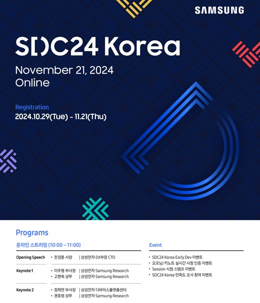삼성전자가 다음 달 21일 '삼성 개발자 콘퍼런스 코리아 2024(SDC24 Korea)'를 온라인으로 개최한다고 29일 밝혔다.